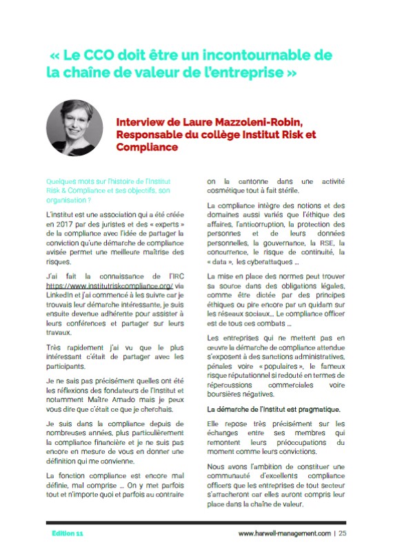 Retrouvez l’actualité de l’institut du Risk et Compliance avec l’interview intégrale de Mme Laure Mazzoleni-Robin sur les enjeux de l’IRC dans l’Eclairage Harwell Management paru en janvier 2022